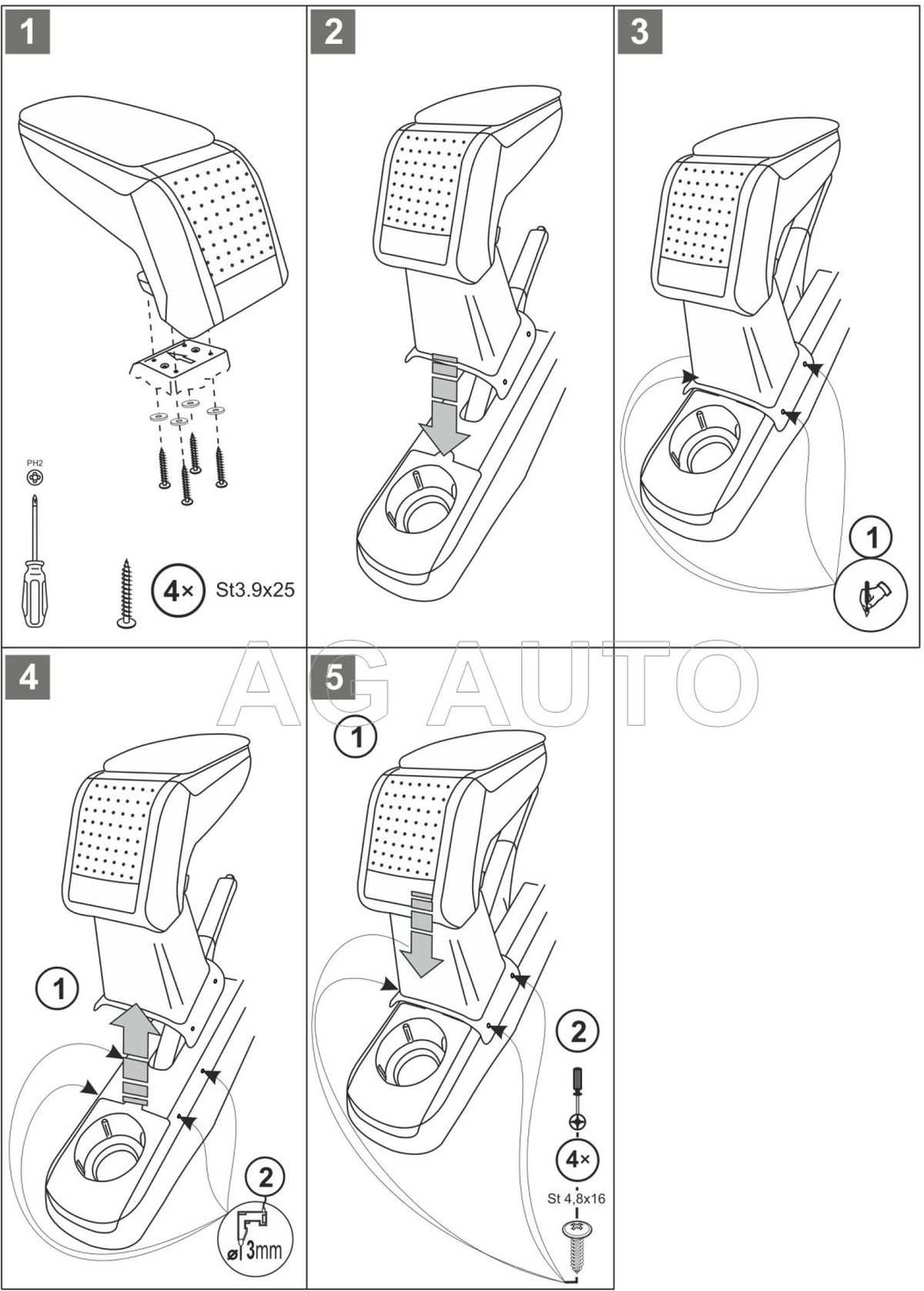 Montaż podłokietnika jest bardzo prosta i nie ma potrzeby odwiedzić serwis samochodowy. Instrukcja obsługi i wkręty do montażu znajdują się w zestawie. Część dolna podłokietnika – adapter, który przykręca się do tunelu środkowego, wykonany jest pod kształt konkretnego modelu auta, dlatego zawsze doskonale pasuje. Nie jest to uniwersalny adapter!