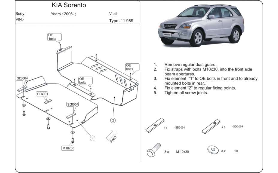 Osłony dopasowane są do konkretnego modelu samochodu i dlatego można je łatwo zamontować w fabryczne miejsca montażowe auta. Jednak zalecamy odwiedzić mechanika. Elementy montażowe w opakowaniu.