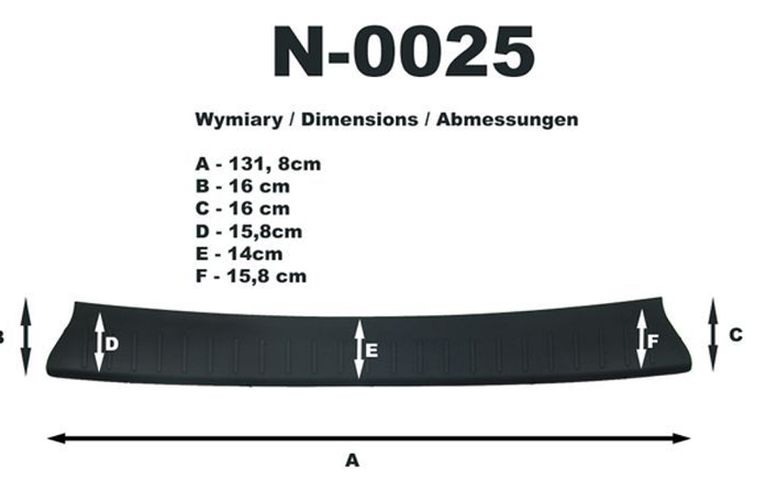 Listwa ochronna bagażnika jest produkowana z czarnego plastiku ABS charakteryzującego się wielką odpornością przeciw uszkodzeniom oraz otarciom. Prosty montaż listwy za pomocą taśmy obustronnej, która jest zawartością zestawu.