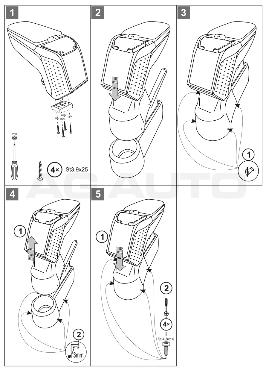 Montaż podłokietnika jest bardzo prosta i nie ma potrzeby odwiedzić serwis samochodowy. Instrukcja obsługi i wkręty do montażu znajdują się w zestawie. Część dolna podłokietnika – adapter, który przykręca się do tunelu środkowego, wykonany jest pod kształt konkretnego modelu auta, dlatego zawsze doskonale pasuje. Nie jest to uniwersalny adapter!
