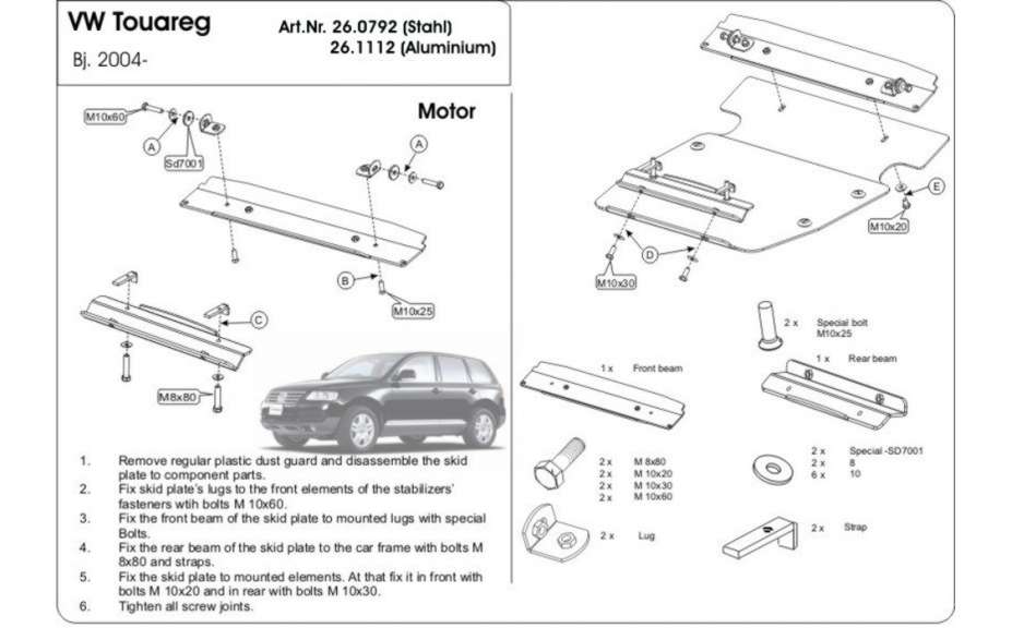 Osłony dopasowane są do konkretnego modelu samochodu i dlatego można je łatwo zamontować w fabryczne miejsca montażowe auta. Jednak zalecamy odwiedzić mechanika. Elementy montażowe w opakowaniu.