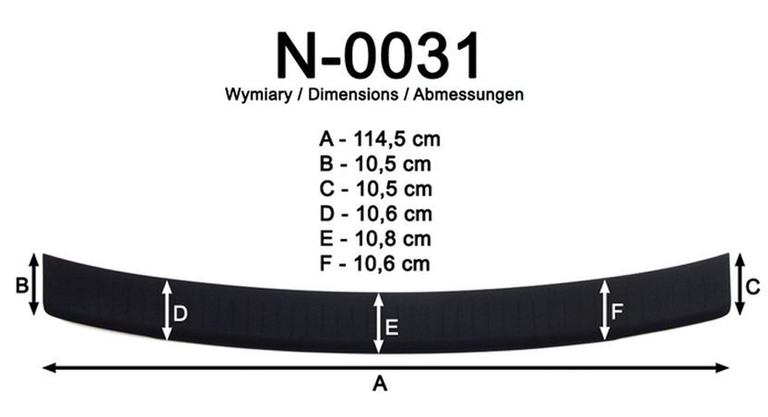 Listwa ochronna bagażnika jest produkowana z czarnego plastiku ABS charakteryzującego się wielką odpornością przeciw uszkodzeniom oraz otarciom. Prosty montaż listwy za pomocą taśmy obustronnej, która jest zawartością zestawu.