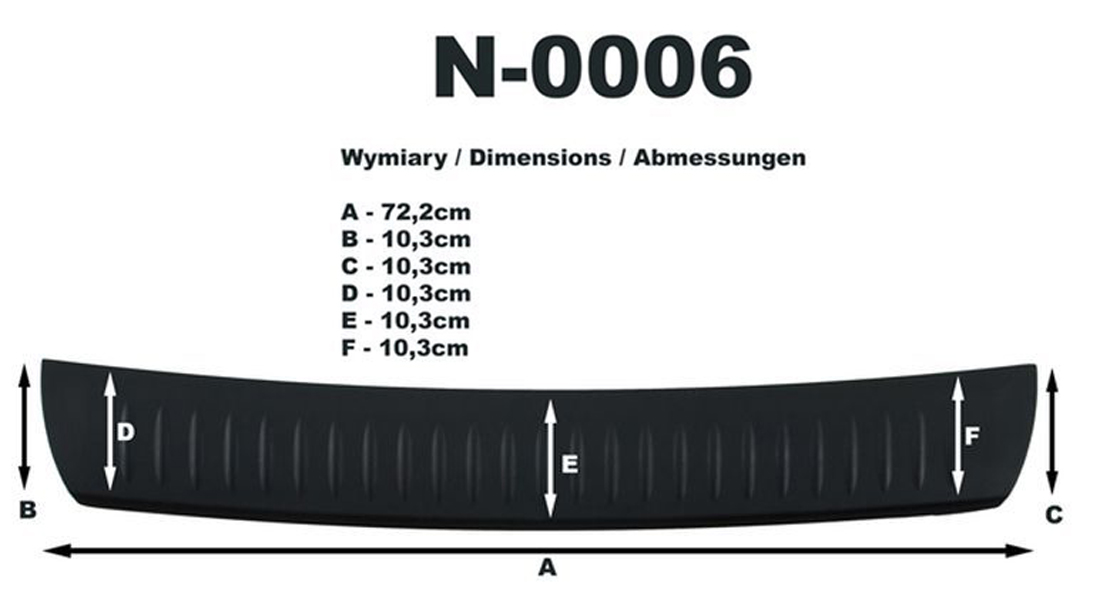 Listwa ochronna bagażnika jest produkowana z czarnego plastiku ABS charakteryzującego się wielką odpornością przeciw uszkodzeniom oraz otarciom. Prosty montaż listwy za pomocą taśmy obustronnej, która jest zawartością zestawu.