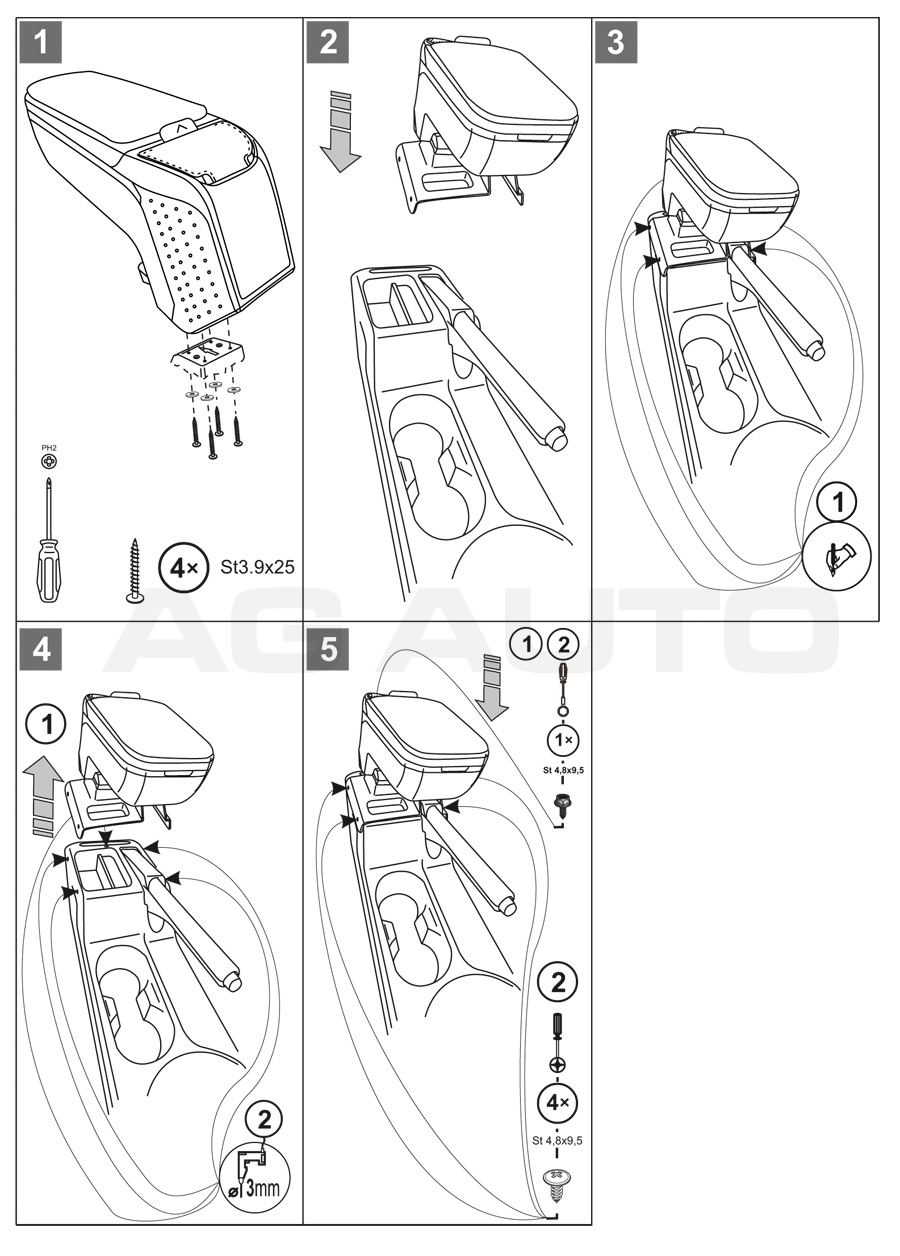 Montaż podłokietnika jest bardzo prosta i nie ma potrzeby odwiedzić serwis samochodowy. Instrukcja obsługi i wkręty do montażu znajdują się w zestawie. Część dolna podłokietnika – adapter, który przykręca się do tunelu środkowego, wykonany jest pod kształt konkretnego modelu auta, dlatego zawsze doskonale pasuje. Nie jest to uniwersalny adapter!