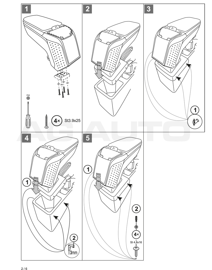 Montaż podłokietnika jest bardzo prosta i nie ma potrzeby odwiedzić serwis samochodowy. Instrukcja obsługi i wkręty do montażu znajdują się w zestawie. Część dolna podłokietnika – adapter, który przykręca się do tunelu środkowego, wykonany jest pod kształt konkretnego modelu auta, dlatego zawsze doskonale pasuje. Nie jest to uniwersalny adapter!