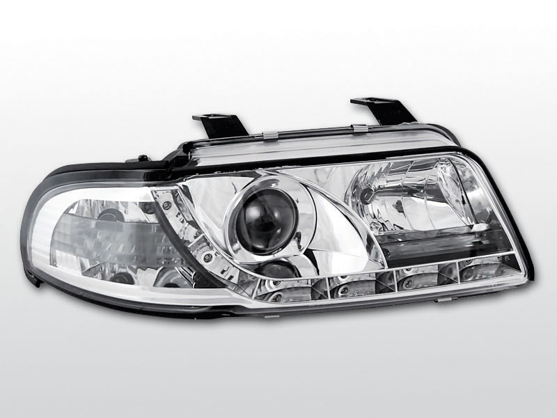 Lampy soczewkowe z paskiem diodowym. Chromowane ze zintegrowanymi kierunkowskazami.