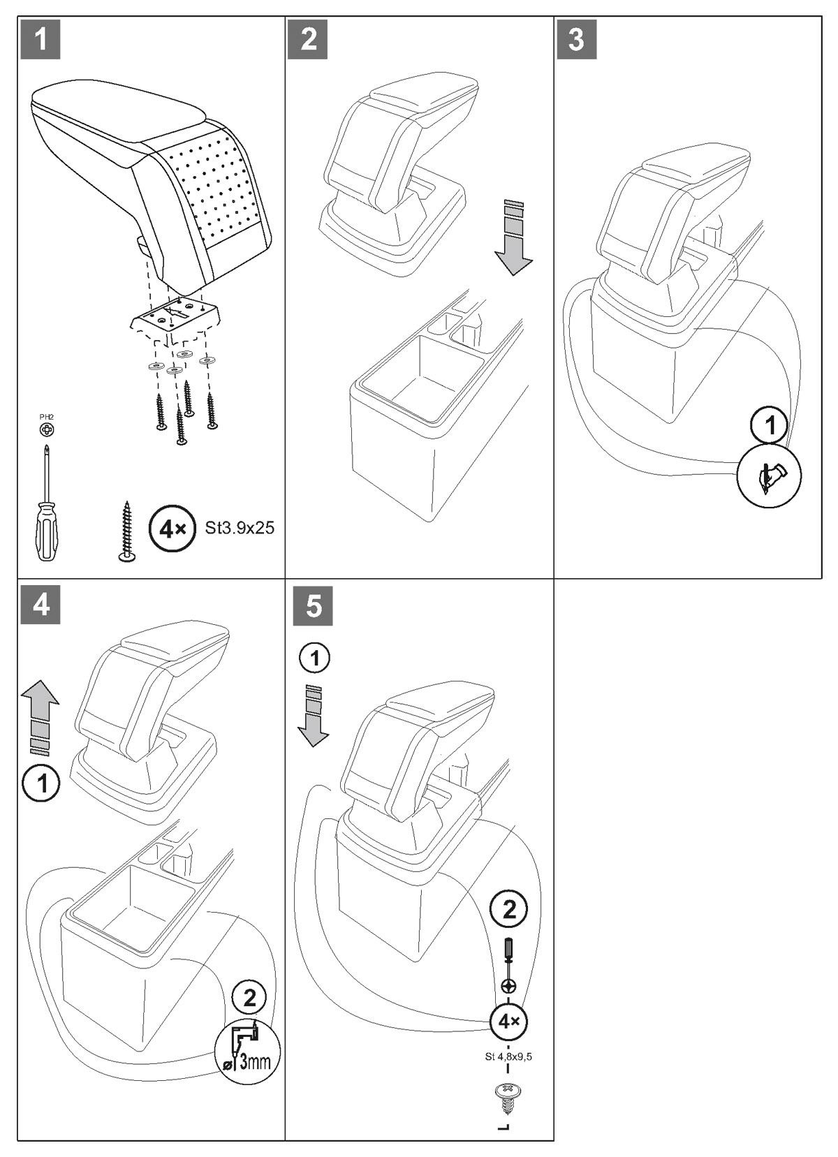 Montaż podłokietnika jest bardzo prosta i nie ma potrzeby odwiedzić serwis samochodowy. Instrukcja obsługi i wkręty do montażu znajdują się w zestawie. Część dolna podłokietnika – adapter, który przykręca się do tunelu środkowego, wykonany jest pod kształt konkretnego modelu auta, dlatego zawsze doskonale pasuje. Nie jest to uniwersalny adapter!