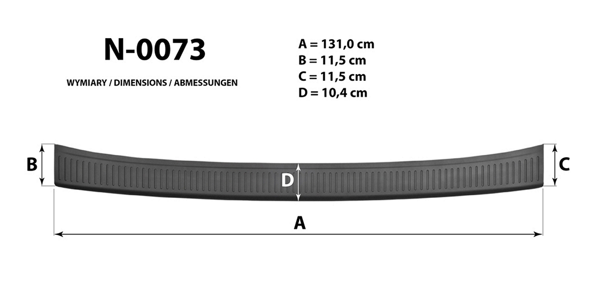 Listwa ochronna bagażnika jest produkowana z czarnego plastiku ABS charakteryzującego się wielką odpornością przeciw uszkodzeniom oraz otarciom. Prosty montaż listwy za pomocą taśmy obustronnej, która jest zawartością zestawu.