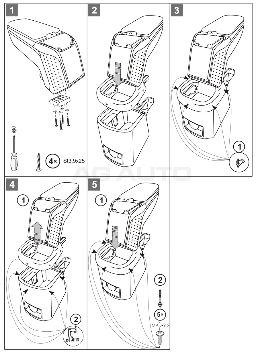 Montaż podłokietnika jest bardzo prosta i nie ma potrzeby odwiedzić serwis samochodowy. Instrukcja obsługi i wkręty do montażu znajdują się w zestawie. Część dolna podłokietnika – adapter, który przykręca się do tunelu środkowego, wykonany jest pod kształt konkretnego modelu auta, dlatego zawsze doskonale pasuje. Nie jest to uniwersalny adapter!