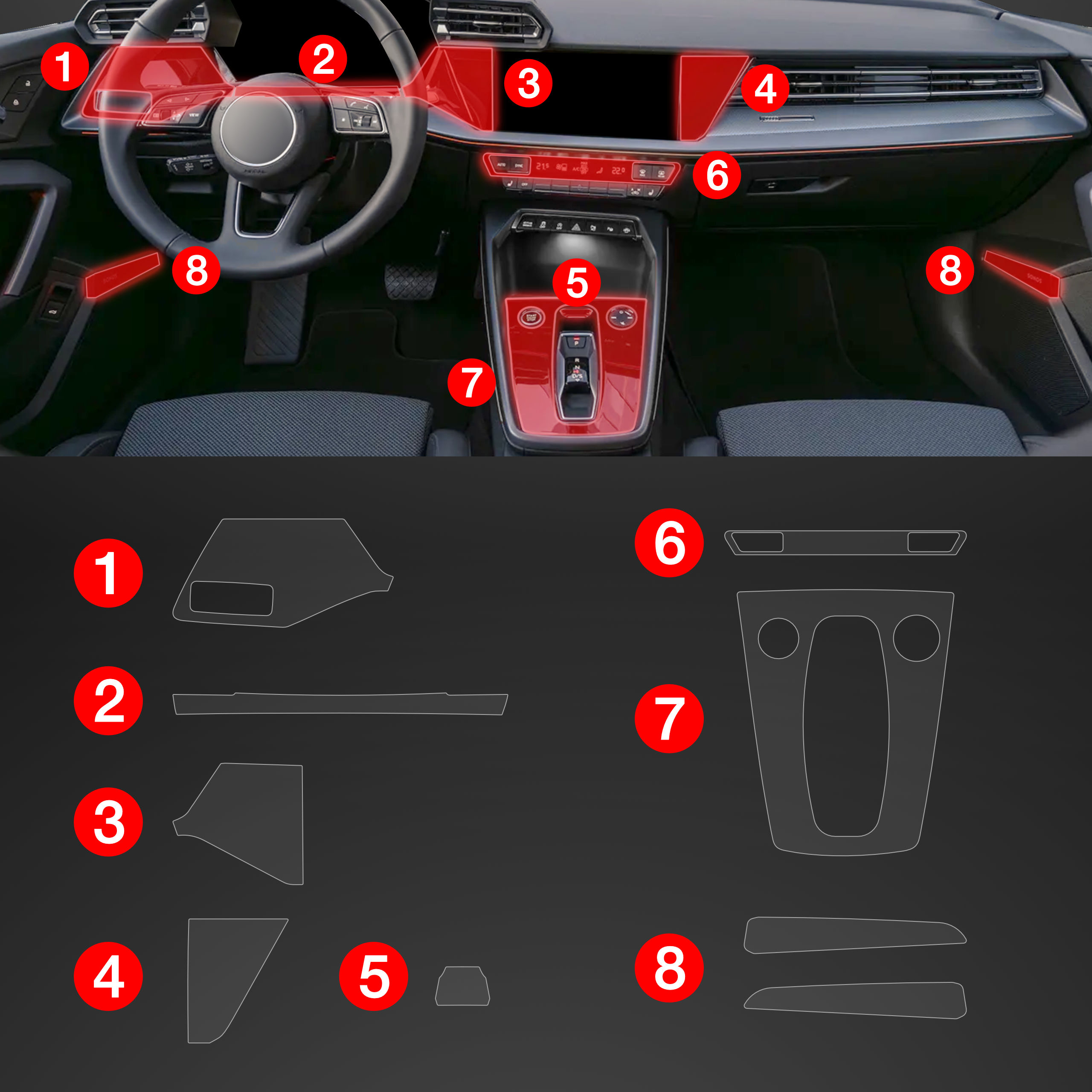 Folia ochronna wnętrza PianoSkin 6v1, Audi A3, 8Y, 2020-2024