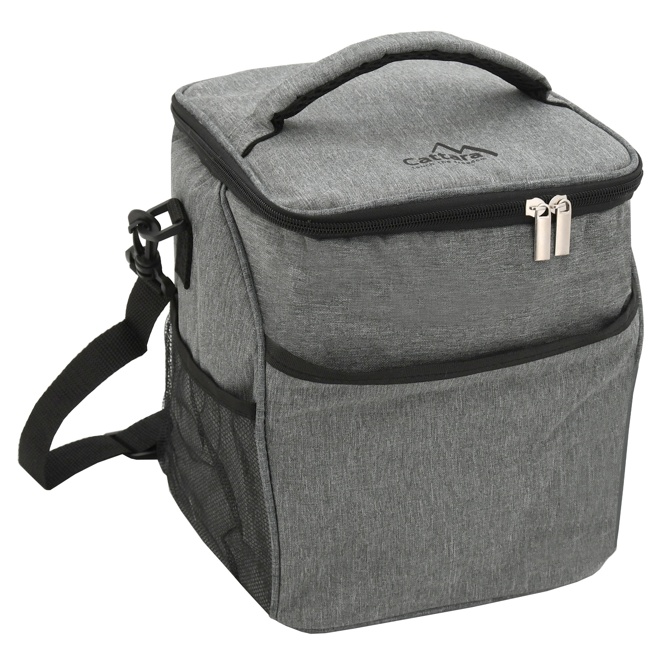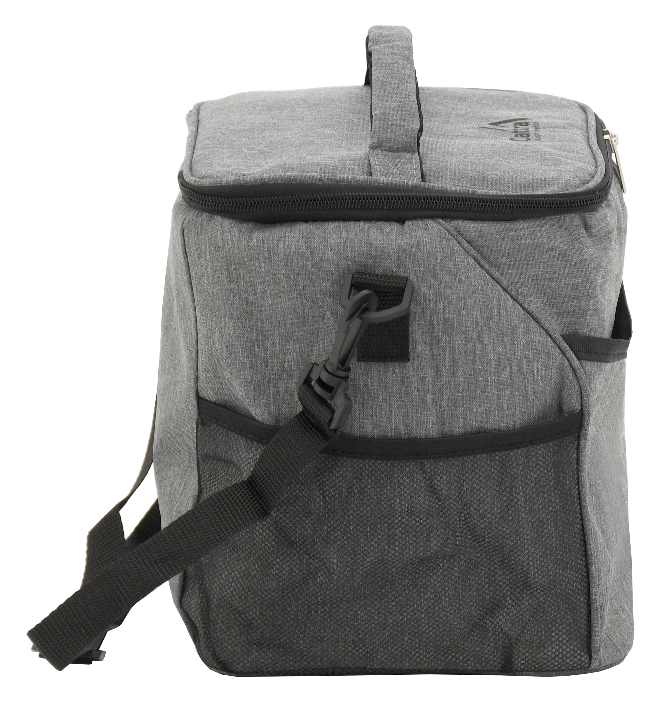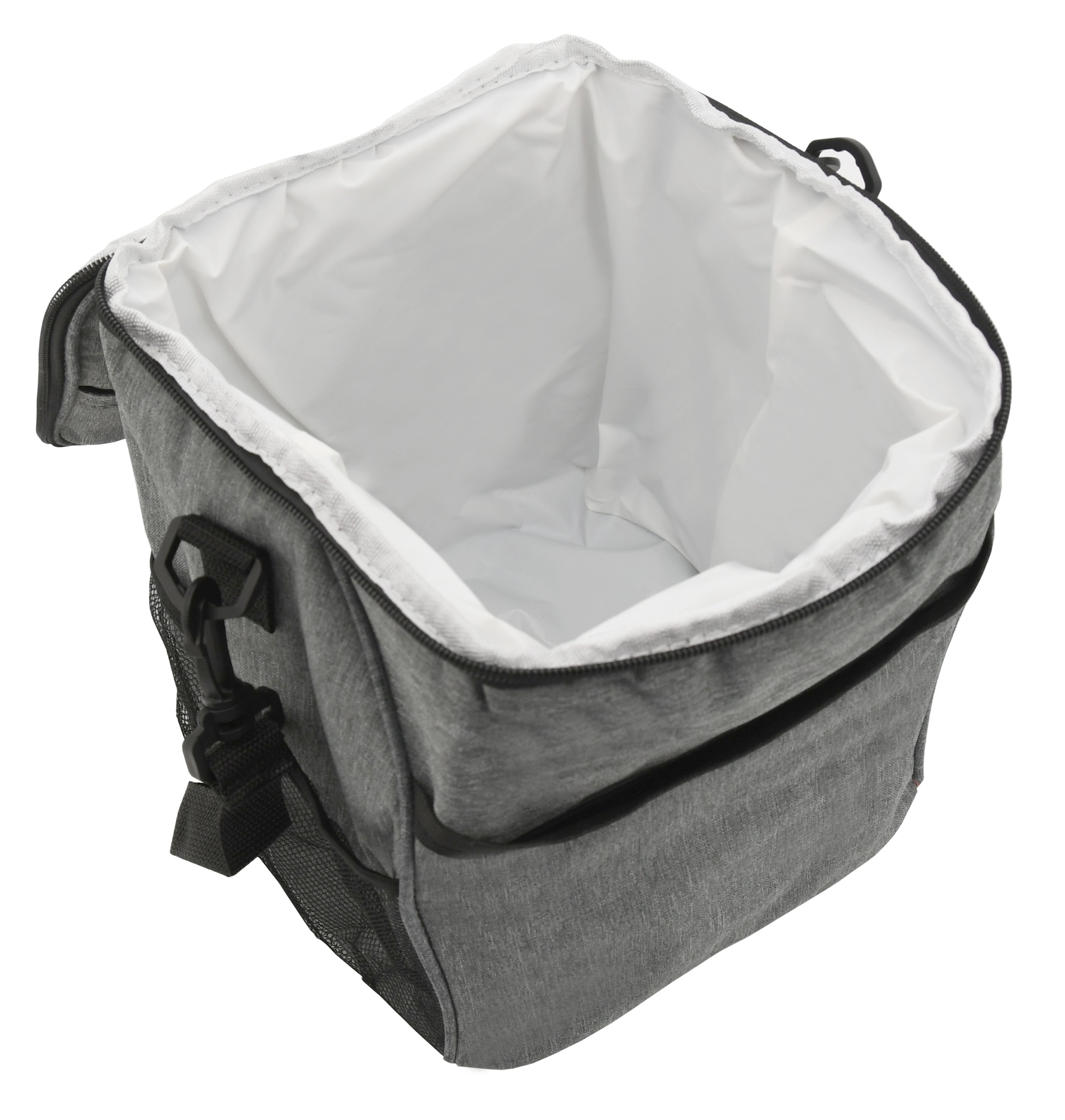 Oprócz głównej termoizolacyjnej przestrzeni, torba z przodu posiada kieszonkę na drobiazgi oraz boczne siatkowe kieszenie na dodatkowe akcesoria.