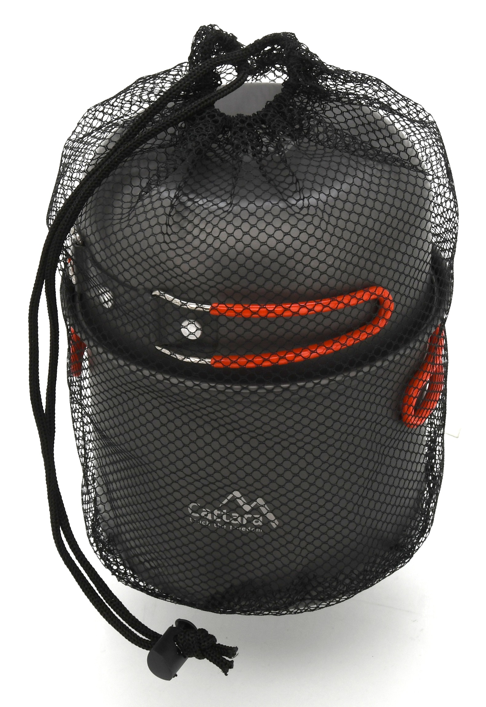 Poszczególne elementy zestawu są dokładnie dopasowane pod względem rozmiarów, dzięki czemu można je złożyć razem, co oszczędza dużo miejsca. Dodatkowo wszystko jest przechowywane w praktycznej siatkowanej torbie.