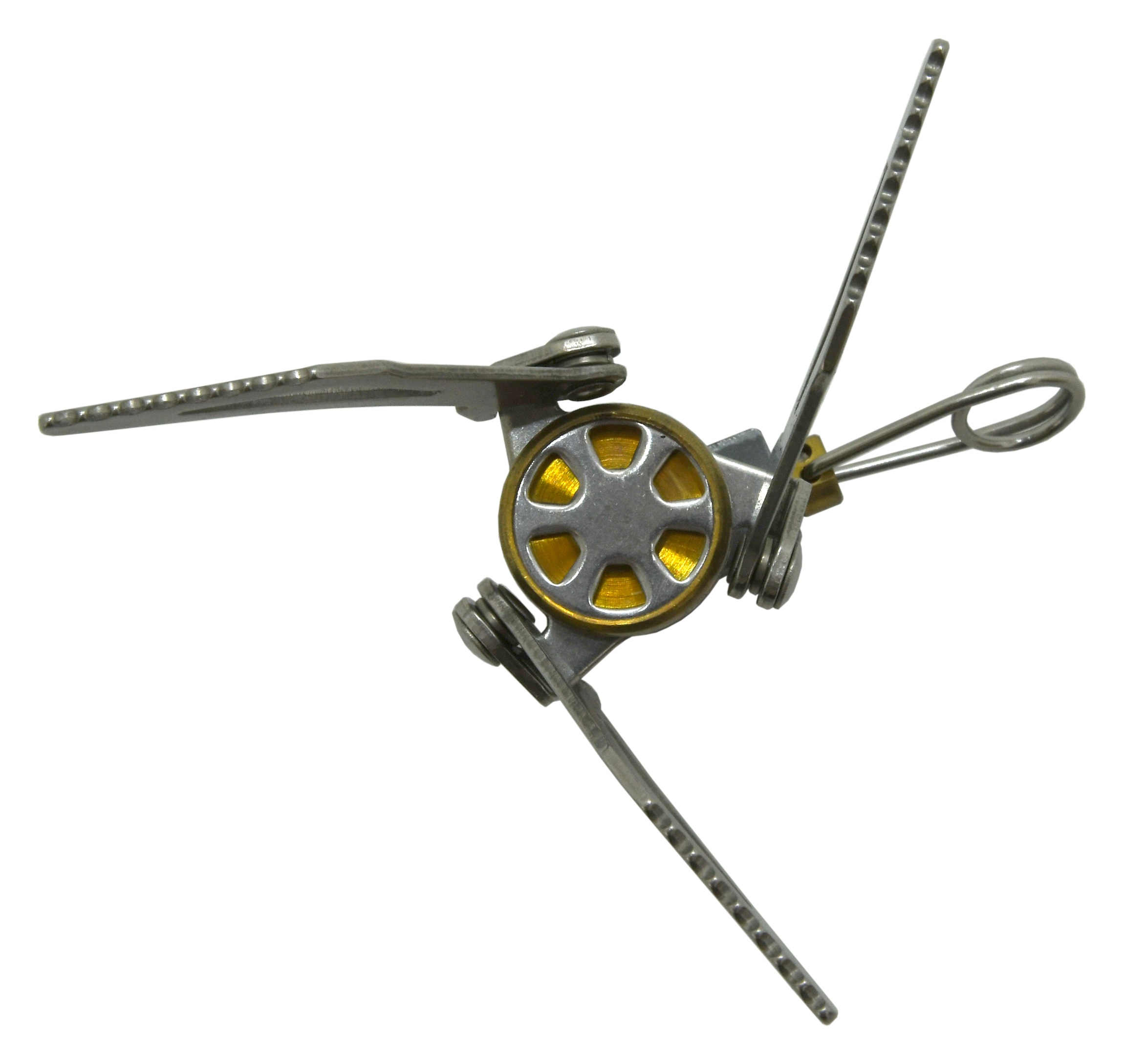 Kuchenka wyposażona jest w składane łopatki, które zapewniają równomierne podgrzewanie garnków, rondli i patelni. Konstrukcja w pełni metalowa, nierdzewna, zapewnia niską wagę przy zachowaniu maksymalnej trwałości i jakości wykonania.