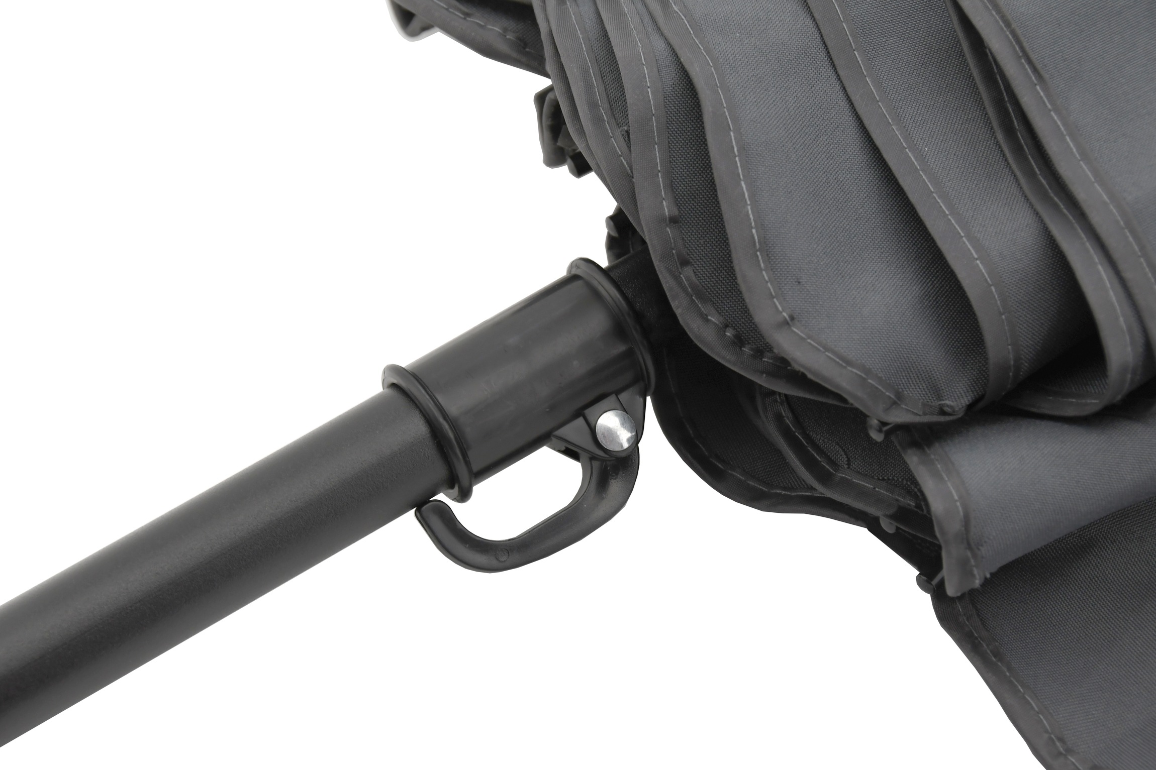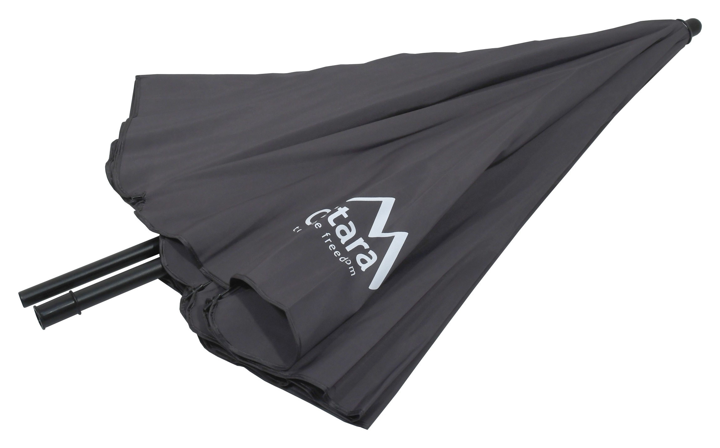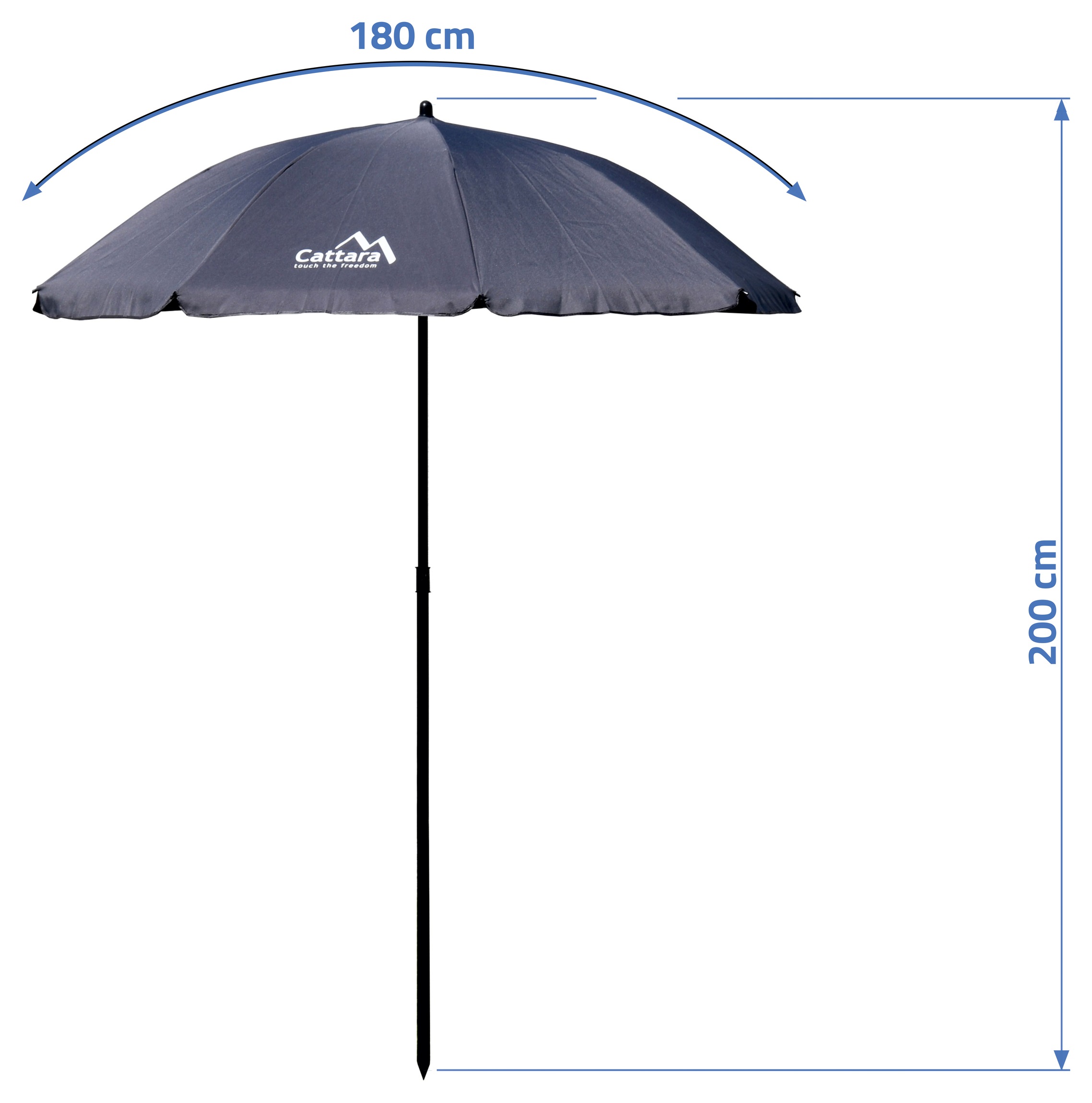 Średnica parasola wynosi 180 cm, a jego całkowita wysokość to 200 cm. Konstrukcja składa się z dwóch części, co umożliwia łatwe złożenie. Wystarczy włożyć obie rury nośne i zablokować je dźwignią. Następnie wystarczy rozciągnąć sam parasol. Konstrukcja parasola ma szpiczaste zakończenie, dzięki czemu jest odpowiednia do wbicia w ziemię.