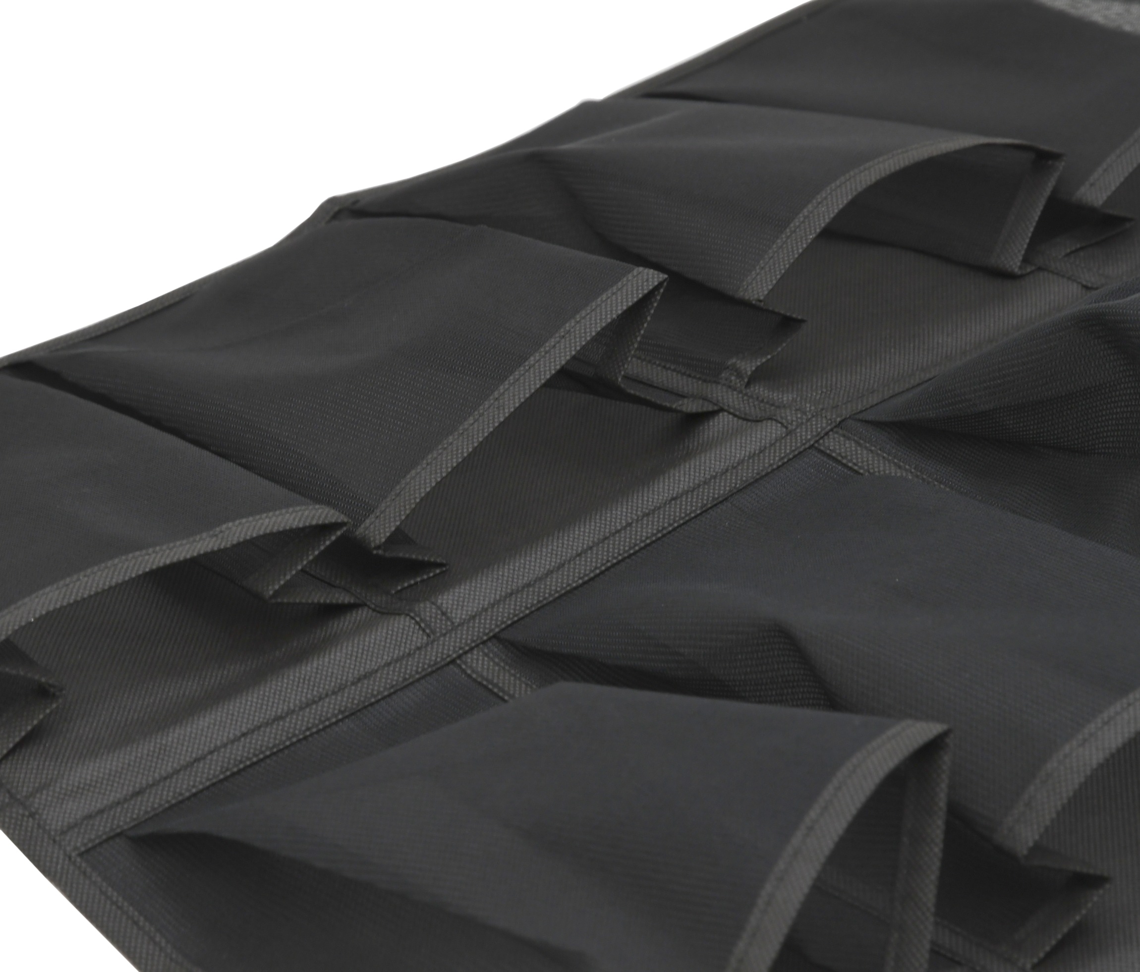 Organizator o wymiarach 55 x 103 cm wyposażony jest w 16 siatkowych kieszeni o wymiarach 12 x 20 cm, do których można umieścić różnorodne przedmioty, takie jak butelki z napojami, latarki czołowe, portfele, zapasowe skarpetki i inne drobne rzeczy.
