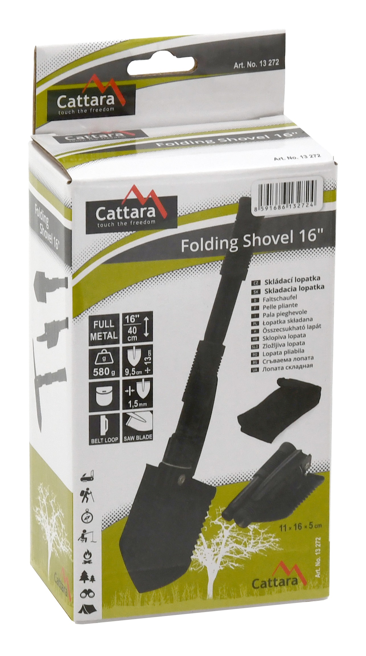 Jest to łopatka o wymiarach 9,5 x 16 cm w złożonym stanie, sprzedawana razem z wytrzymałym tekstylnym pokrowcem w kolorze zielonym, który można przymocować do pasa.