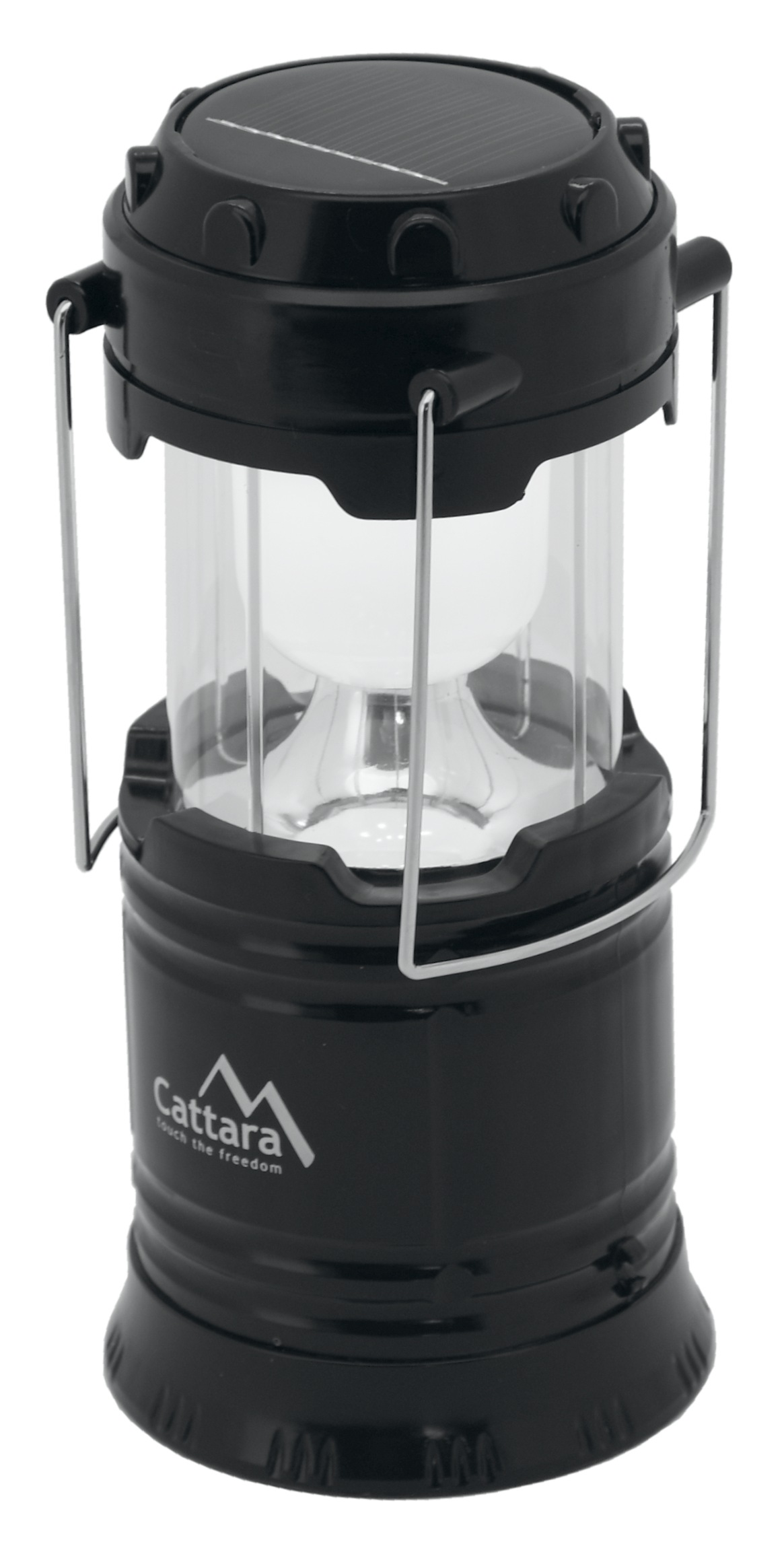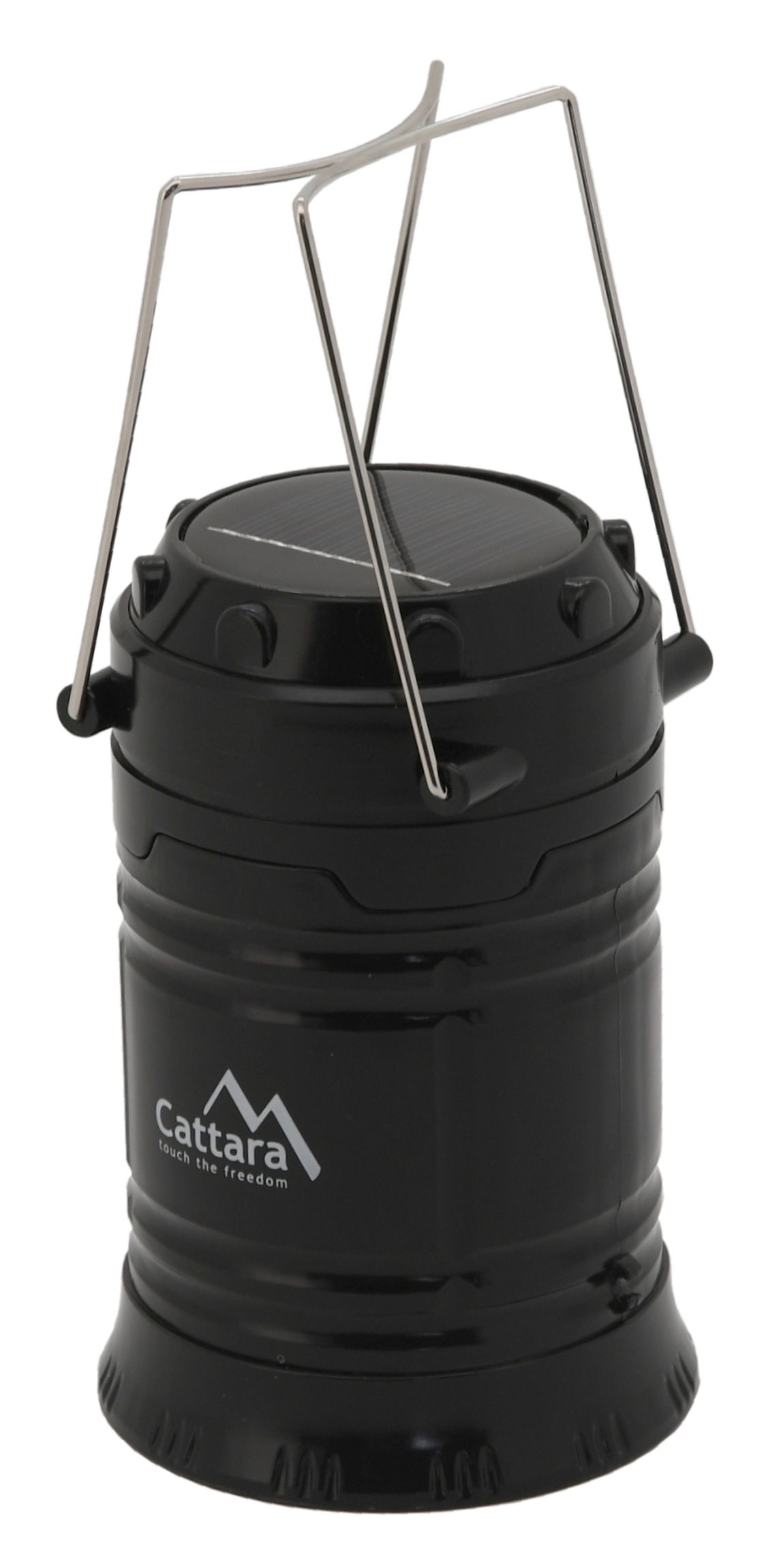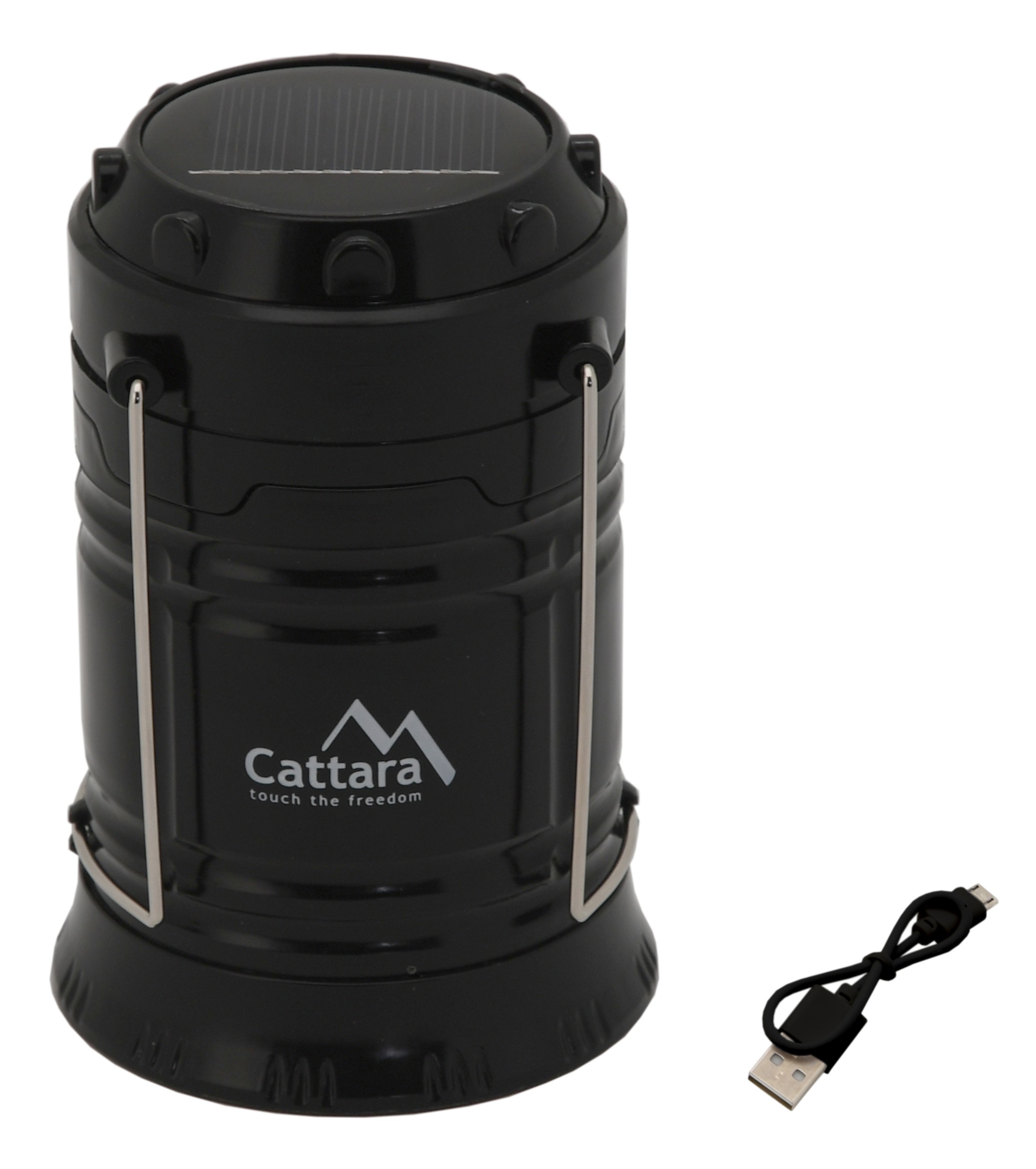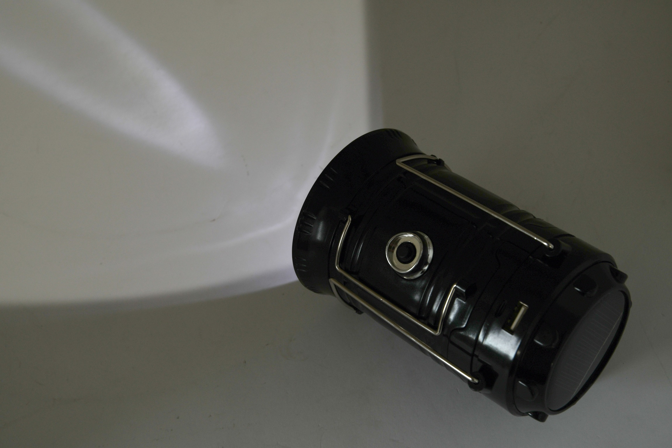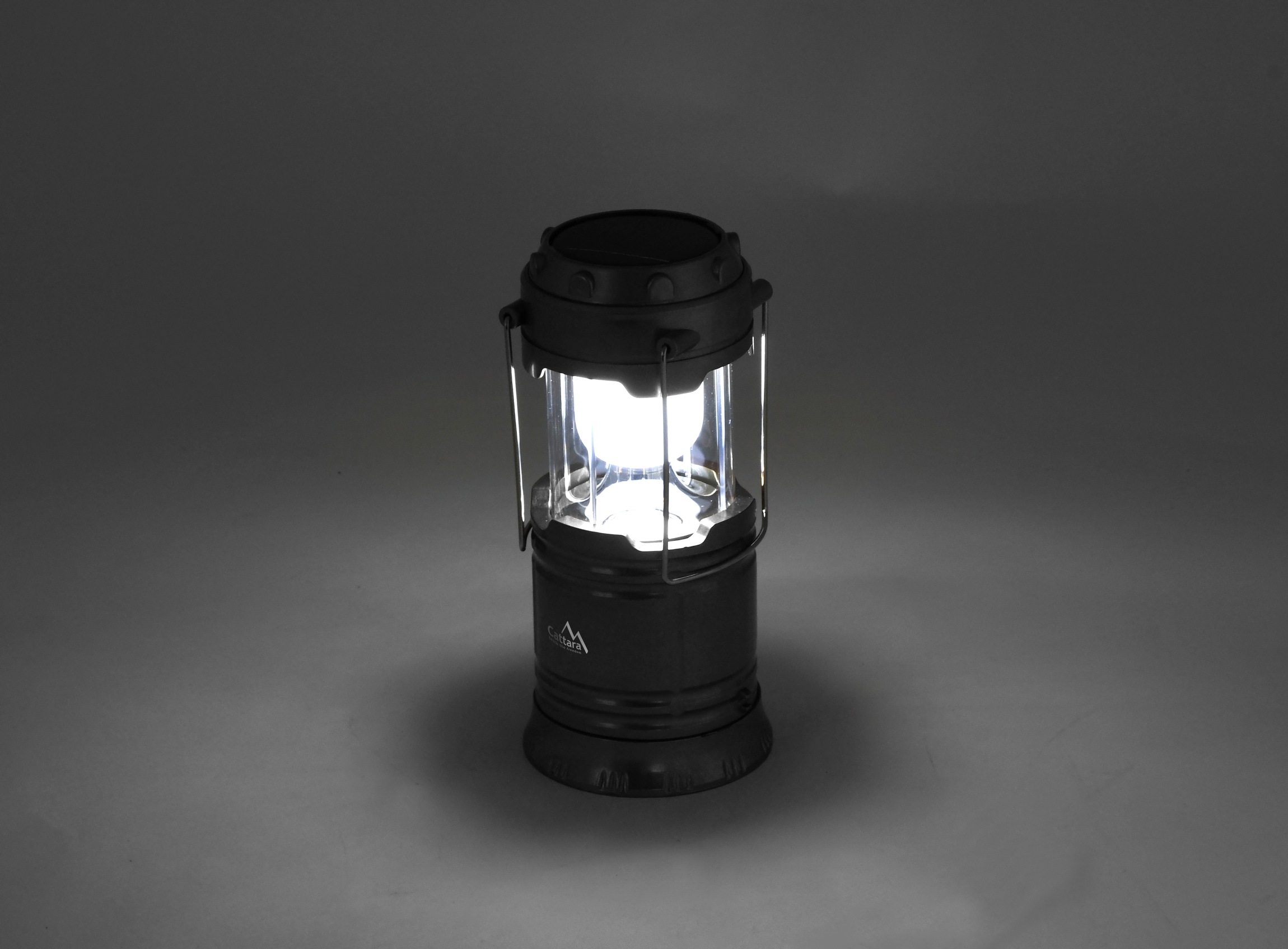 Kempingowa latarka LED z teleskopową konstrukcją, wyposażona w akumulator Li-Ion oraz panel słoneczny.