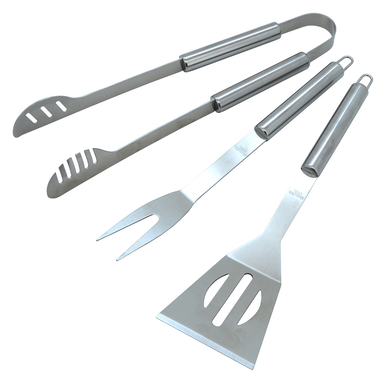 Zestaw narzędzi do grillowania, składający się z łopatki, widelca i szczypiec.