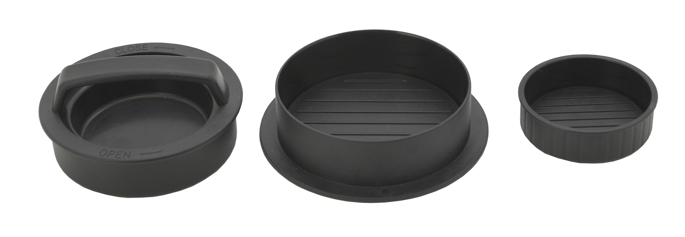 Forma składa się z kilku części, dzięki którym można uformować mięso o średnicach 10 lub 6,5 cm i dowolnym kształcie hamburgera.