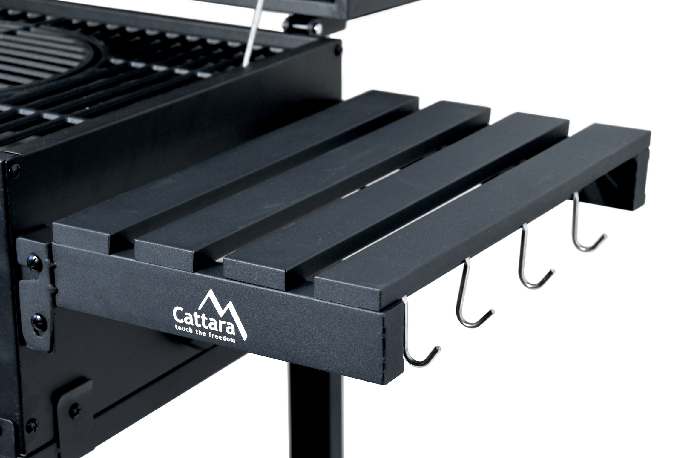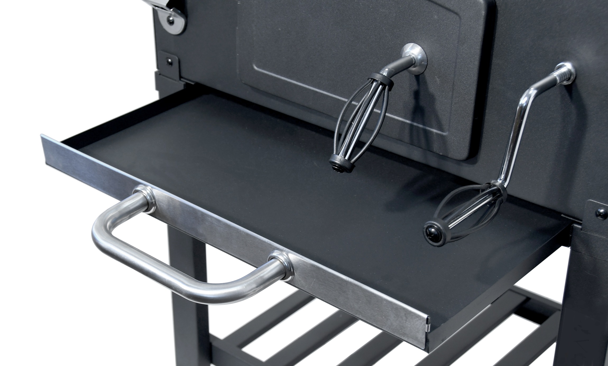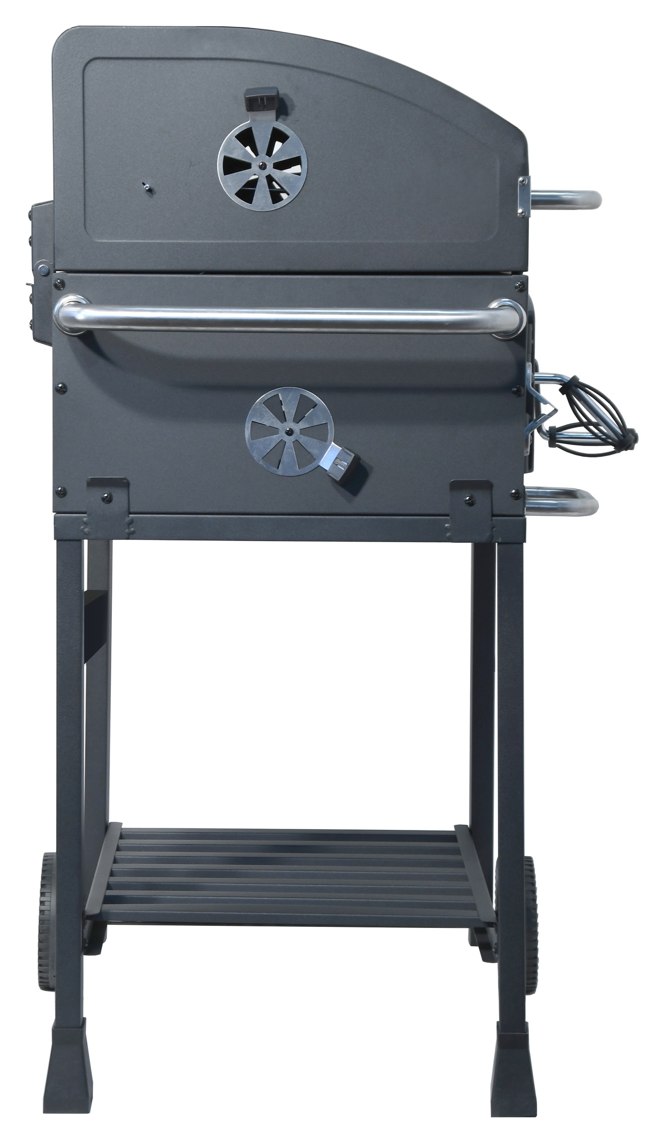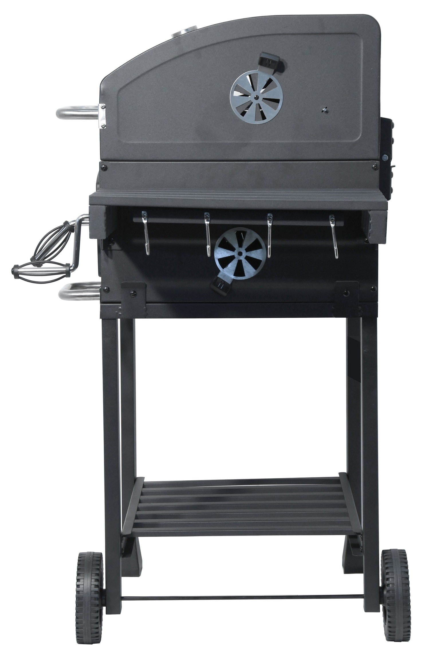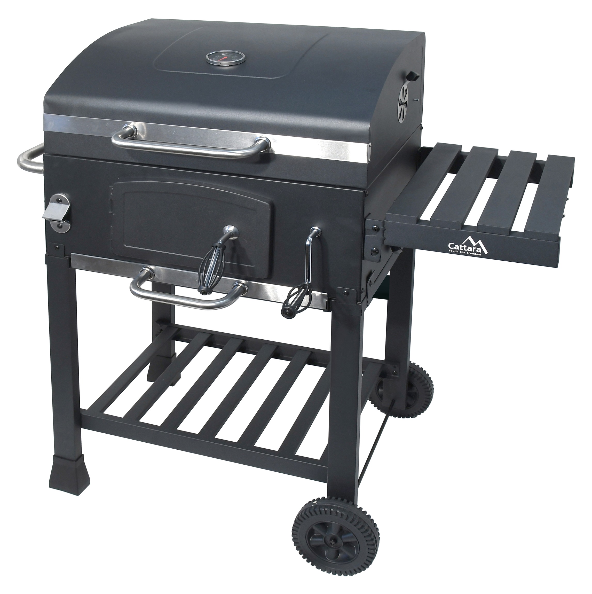 Mobilność zapewniają metalowe nogi z dwoma kółkami, wzmocnione ramą w dolnej części grilla, która również pełni funkcję półki do przechowywania. Boczna strona posiada składany stolik do odkładania akcesoriów grillowych lub gotowych potraw.