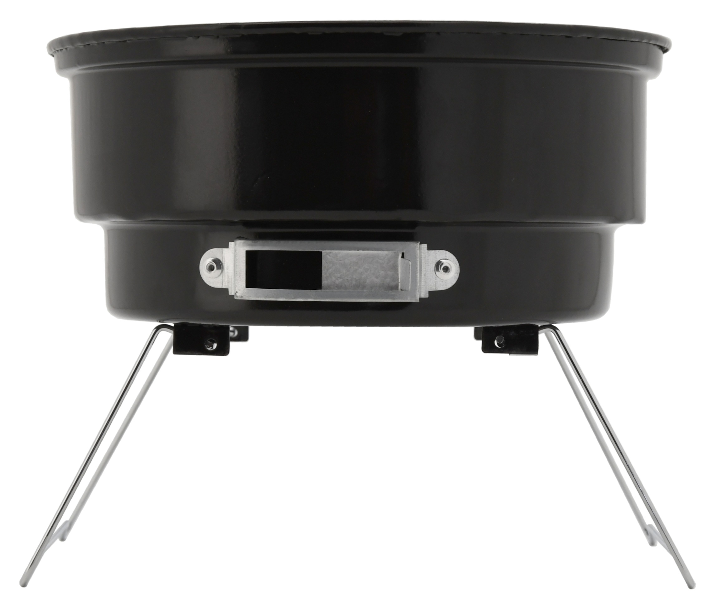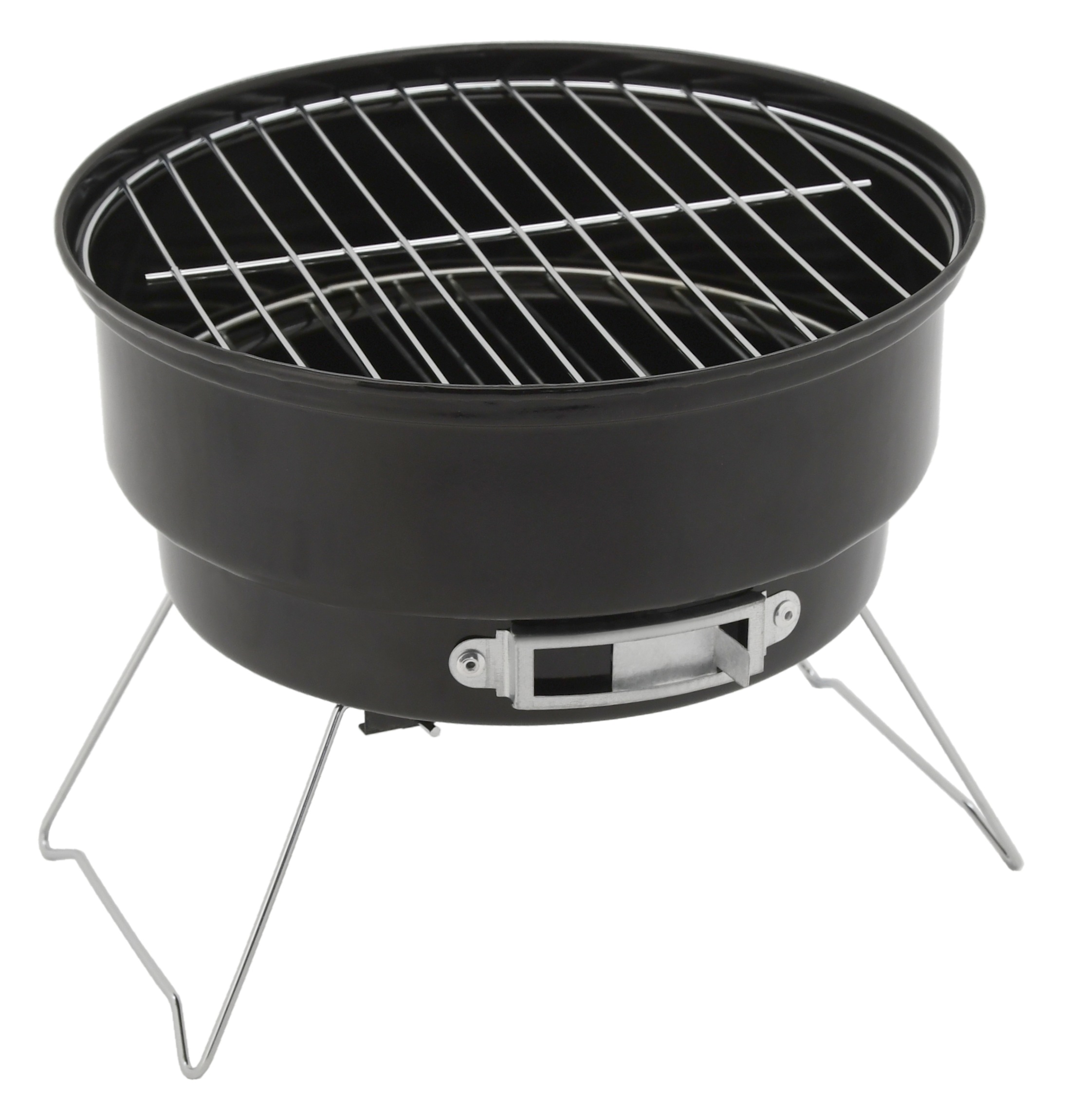 Konstrukcja wykonana z wysokiej jakości emaliowanej blachy stalowej w kolorze czarnym. Stabilność zapewniają dwie metalowe, składane nogi. Całkowite wymiary grilla to 26 x 22 x 26 cm.